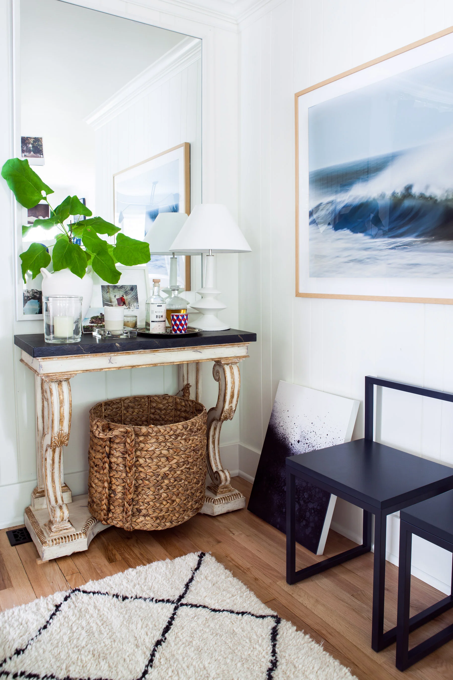 As a fan of seaside living, Michelle gravitates toward art depicting water. Above in her living room she pairs Waves with Spray by Greg Anthon with Escape by Elaina Sullivan. Photo by Marta Xochilt Perez.