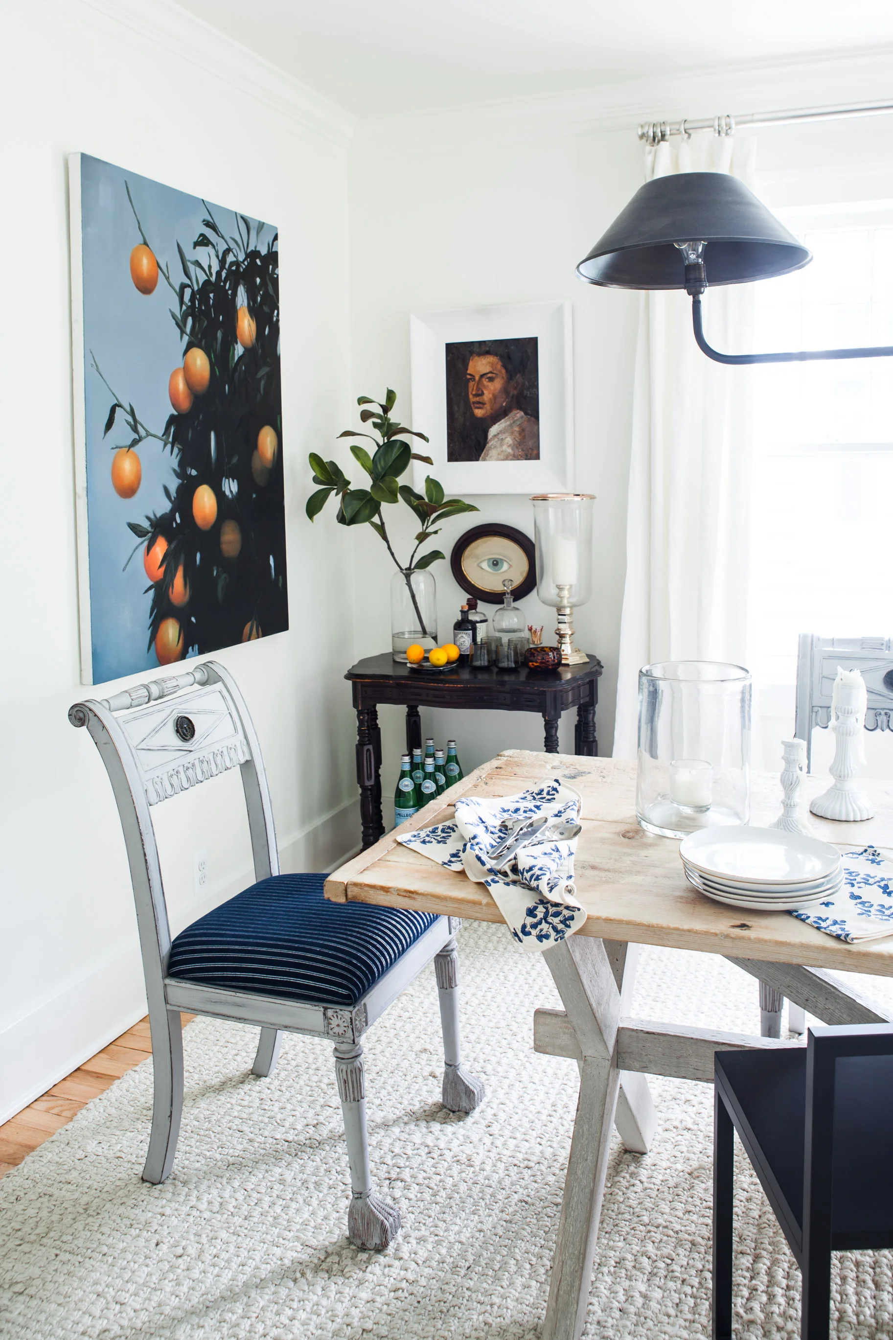 MA: Keep scale in mind, use art to create focal points in each room, and if you'd like, try a common subject matter. In my home I have many pieces that depict water--from photography to oil paintings, line drawings, and even pieces made from resin. I also love to create trios with one modern piece, one photograph and one oil portrait. The combination feels balanced and collected over time.