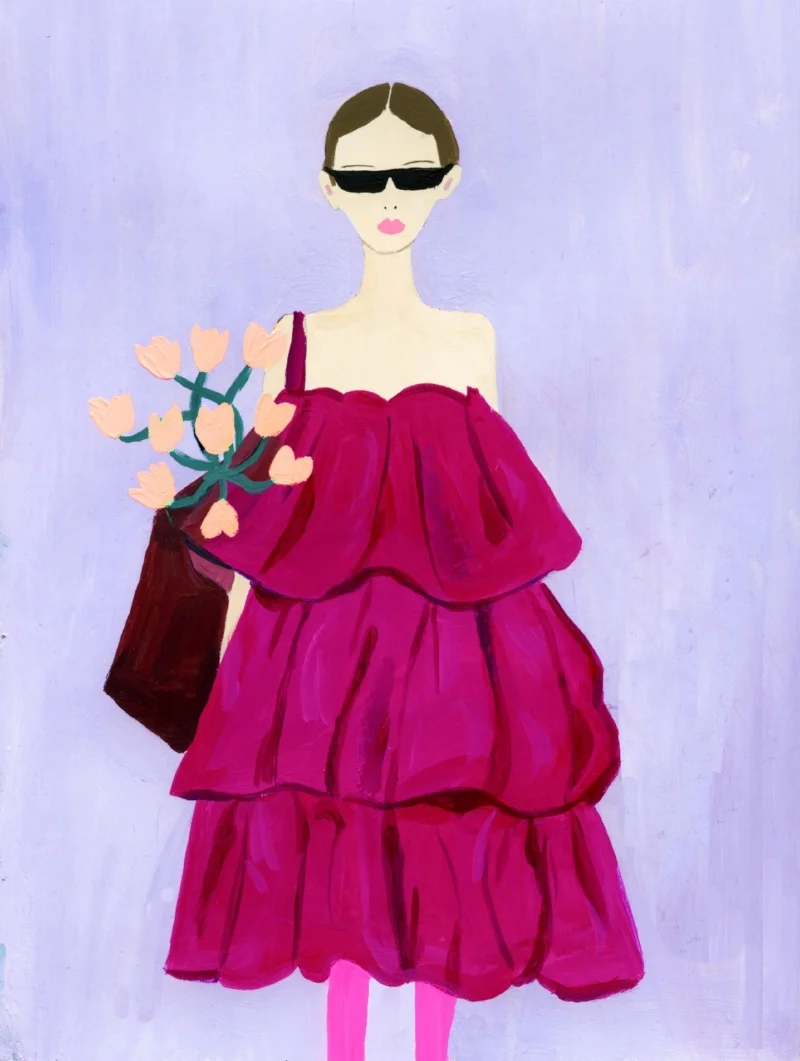 KS: I am inspired by the women in my life: my mother, my friends. I am surrounded by so many interesting, complicated women. I like to paint ladies with classic female decorations; beautiful clothes, flowers, feminine colors, but give them something a little more behind the eyes than just "pretty". It feels more authentic to me when there is some mix of melancholy, wildness, longing, passion, frustration to counter the surface beauty. For example, the girl in the pink dress with the tulips does not feel like a fairy princess. She might feel a little moody and pissed off, her hair is slicked back in a masculine manner and all of that attitude is part of the whole picture. It makes her more interesting to me. I'm drawn to imperfect visions of beauty.
