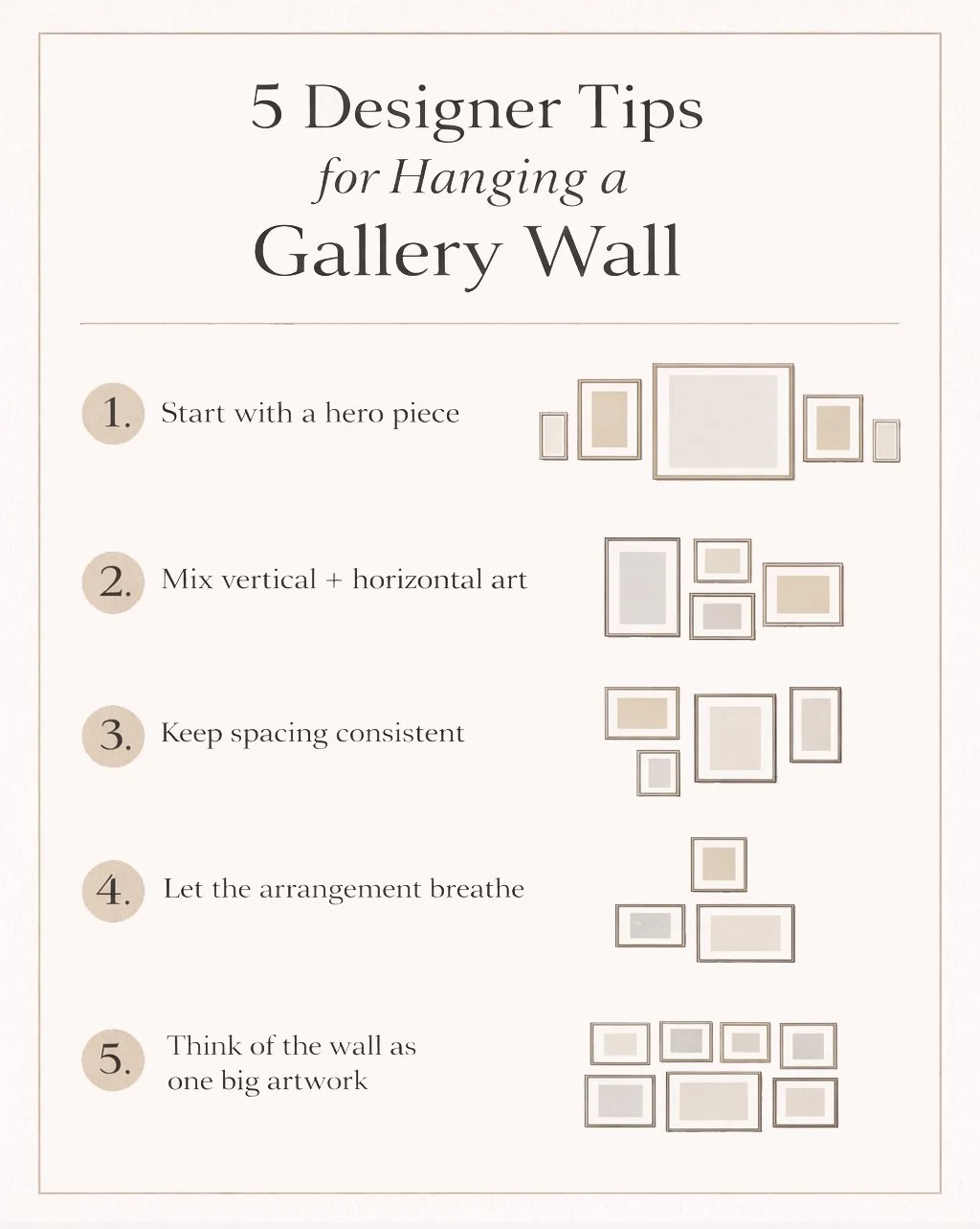 Gallery walls can take many different forms, and there’s no single “correct” way to hang one. Think of these tips as helpful starting points rather than rules to follow all at once. Each approach offers a different way to create balance and visual interest, so choose the one that best suits your space and the artwork you’re working with.